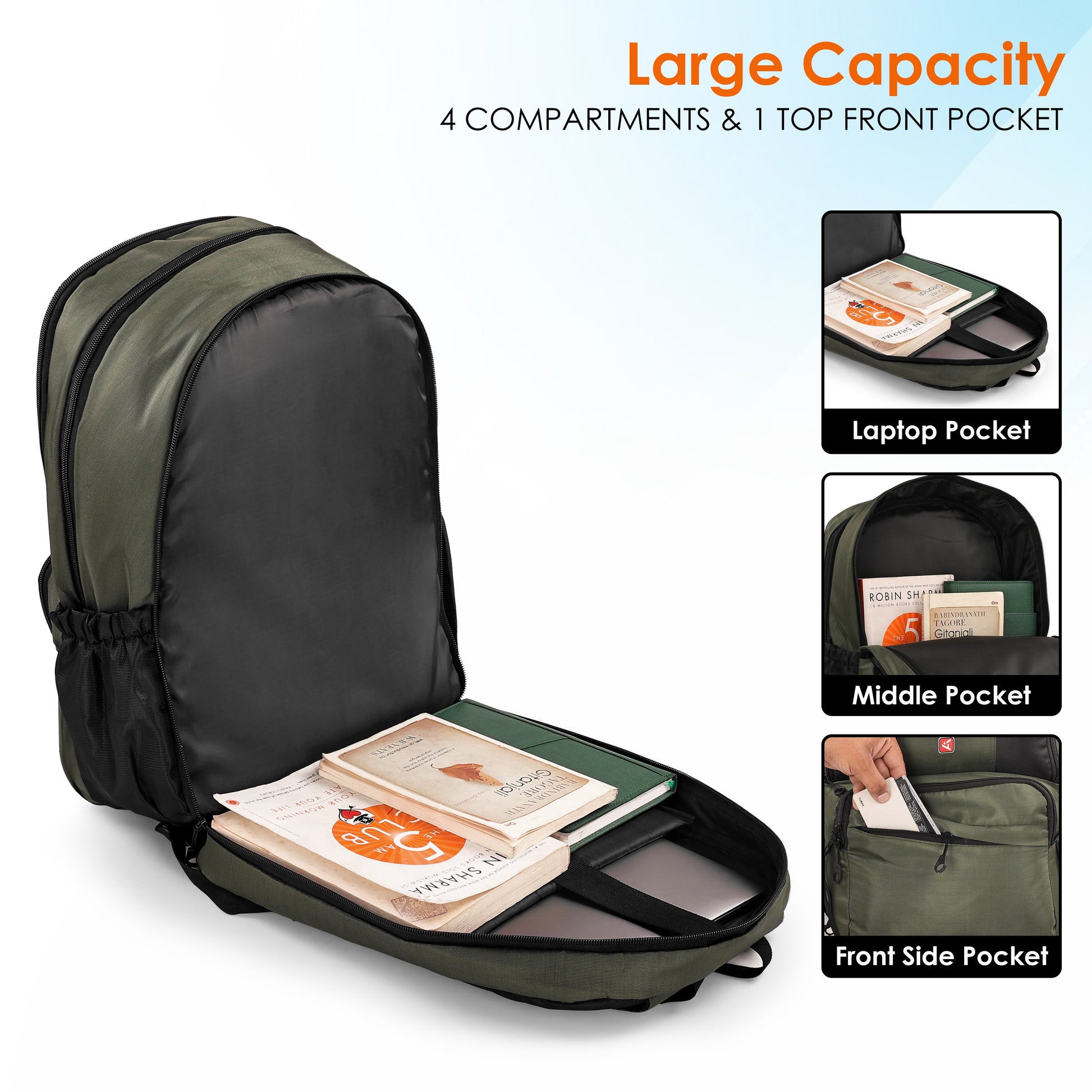 - 4 large compartments + 1 top front pocket